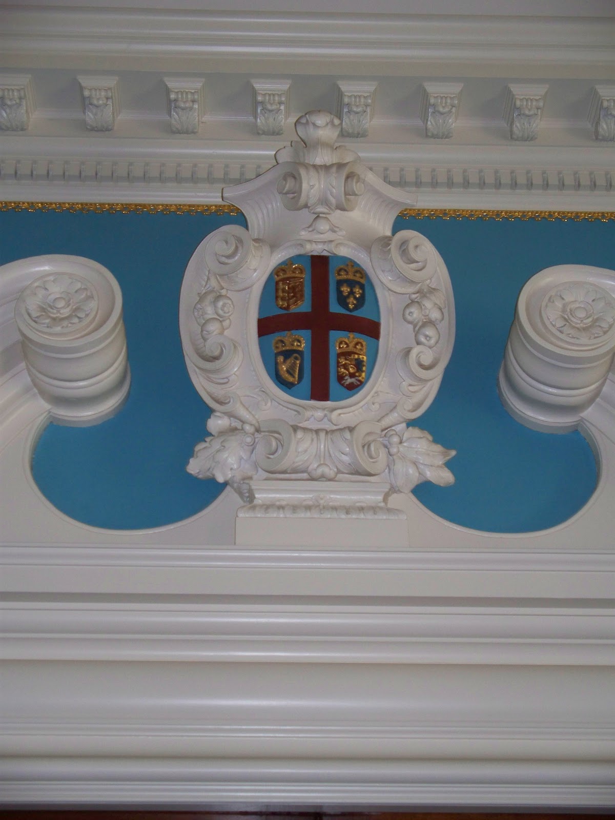 with a close-up view of the royal coat of arms over the rear entrance.